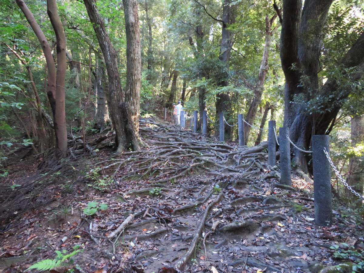 登山口からは、一部舗装された場所もありましたが、それが終わると、今度は木の根が張り巡らされた急登が立ちはだかっています。登山開始時は涼しく快適でしたが、こういった急登との戦いで、早々に汗だくになっています。