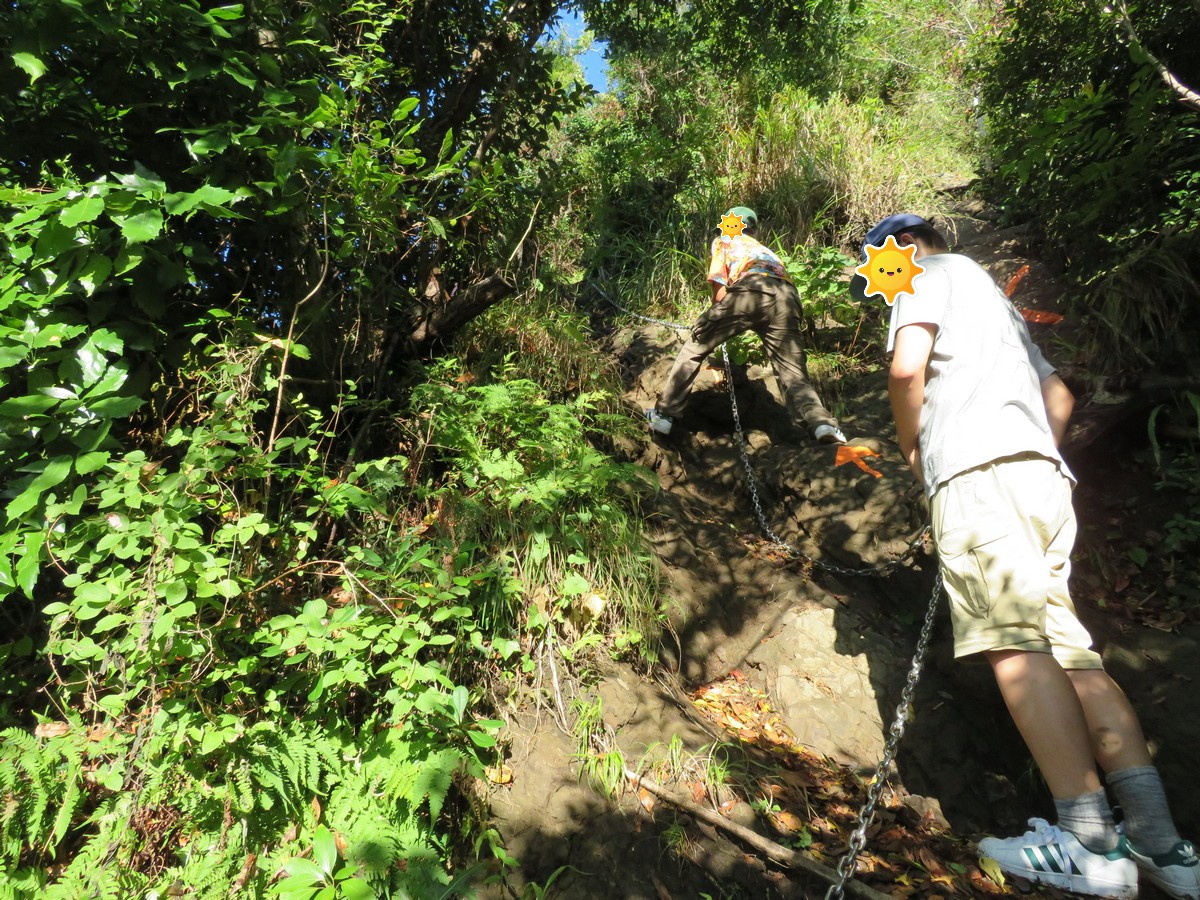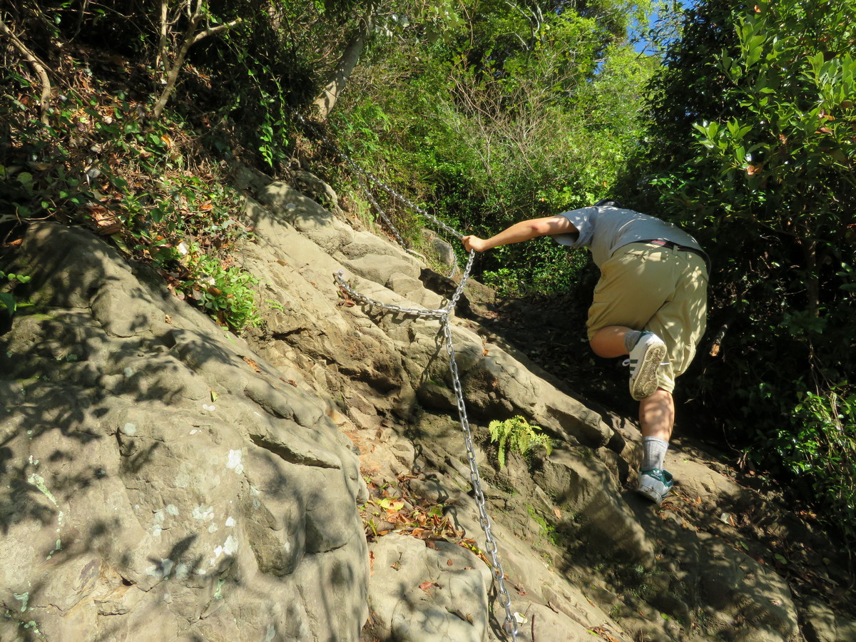 東屋・展望台での休憩を終えると、すぐに核心部とも言える鎖場が目の前に立ちはだかっています。