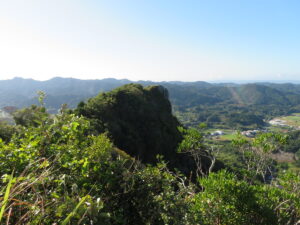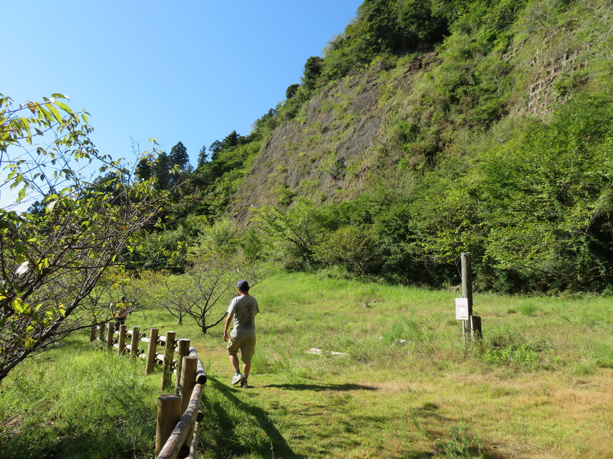 すると、すぐに”房総のマッターホルン”と言われている断崖絶壁の山頂部を眺めることが出来ます。「Y太、あそこだぞ」と指差して教えると、「おっ!」と声を上げ、ロックオンしています。