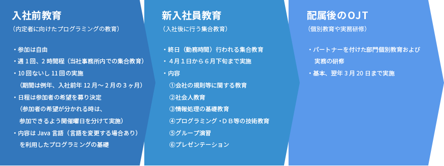 入社式直後から約3カ月間は新入社員教育(集合教育)の期間です。
